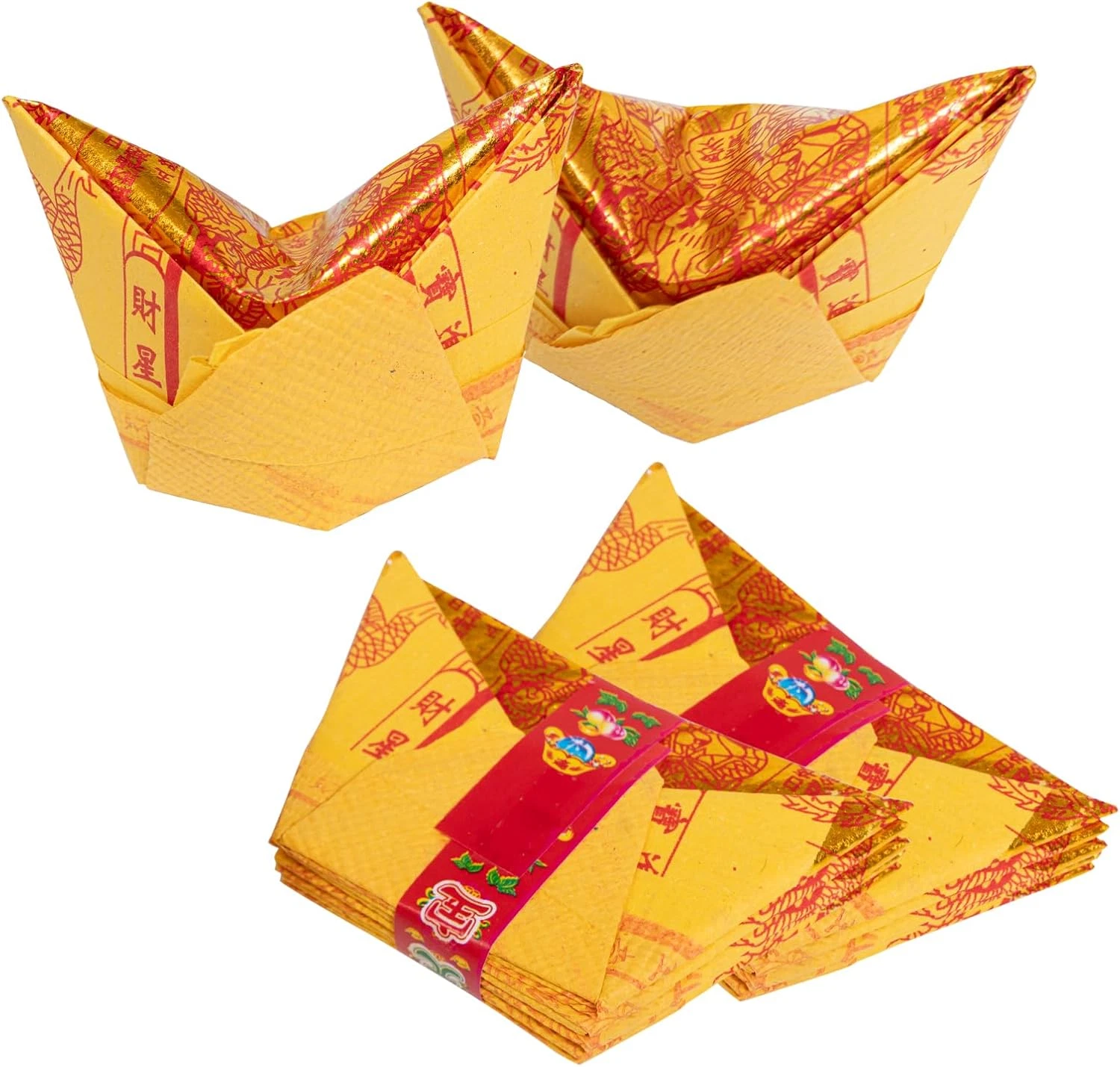 In Chinese tradition, “gold ingots” (jīn yuánbǎo) burned during ancestor worship are symbolic offerings made of paper, not real metal. They represent wealth sent to deceased ancestors in the afterlife.